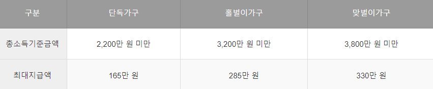 - (근로장려금) 단독가구 2,200만 원, 홑벌이가구 3,200만 원, 맞벌이가구 3,800만 원